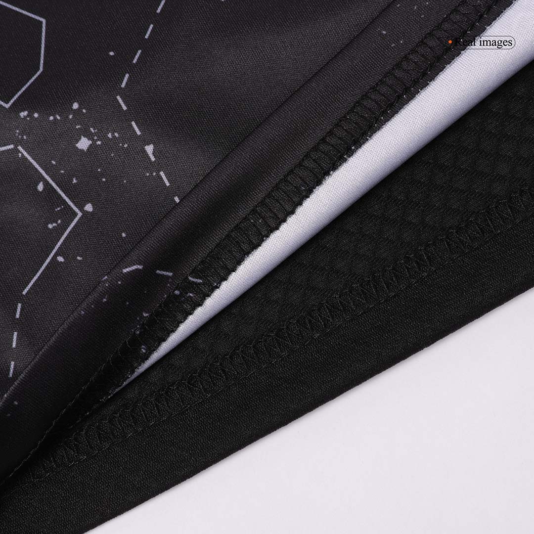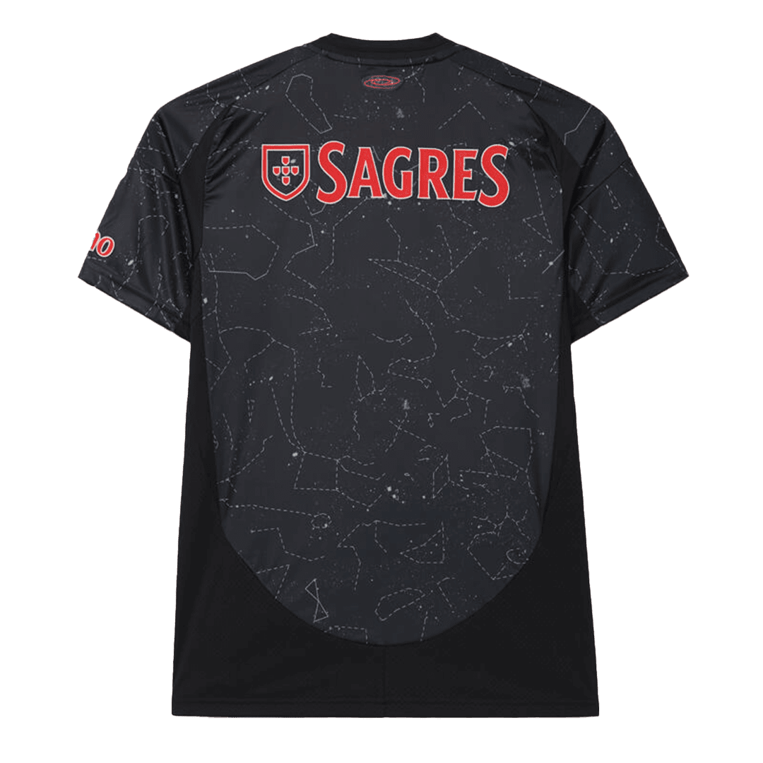 The cheap 2024-2025 Benfica jersey, worn by Sport Lisboa e Benfica, is a sleek black design featuring a star-inspired pattern with vivid red accents adorning the shoulders and sleeves. Paying homage to the alignment of stars on February 28, 1904, this new Benfica jersey symbolizes the historic night that marked the club's inception and the beginning of its illustrious Benfica journey. The striking red three stripes, logo, and Benfica crest further highlight this tribute to all dedicated Benfica supporters, honoring their unwavering presence and support no matter where they may be.